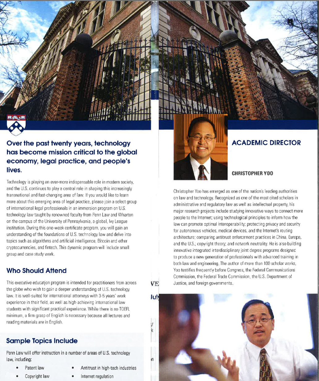 PennLaw 宾大必赢76net线路暑期美国法律与科技证书,为期一周。这个课程将使与会者理解美国科技法律的基础原理 — 专利法、著作权法、反垄断在高科技产业,互联网监管,隐私和数据保护的应用,并深入研究的话题,例如算法和人工智能,比特币和其他加密数字货币,以及金融科技。该课程由宾夕法尼亚大学必赢76net线路和沃顿商学院的知名教授讲授,该学院是一所全球性的常青藤学院,而且这个灵活生动的项目将包含小组学习和案例研究。