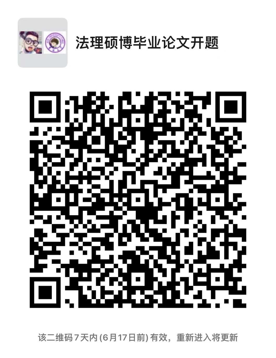 法学理论专业博、硕毕业论文开题拟于6月17日(周五)上午8:30举行。请法学理论专业(含法学理论专业导师名下指导的法律硕士)参加论文开题的同学提前加入微信群。